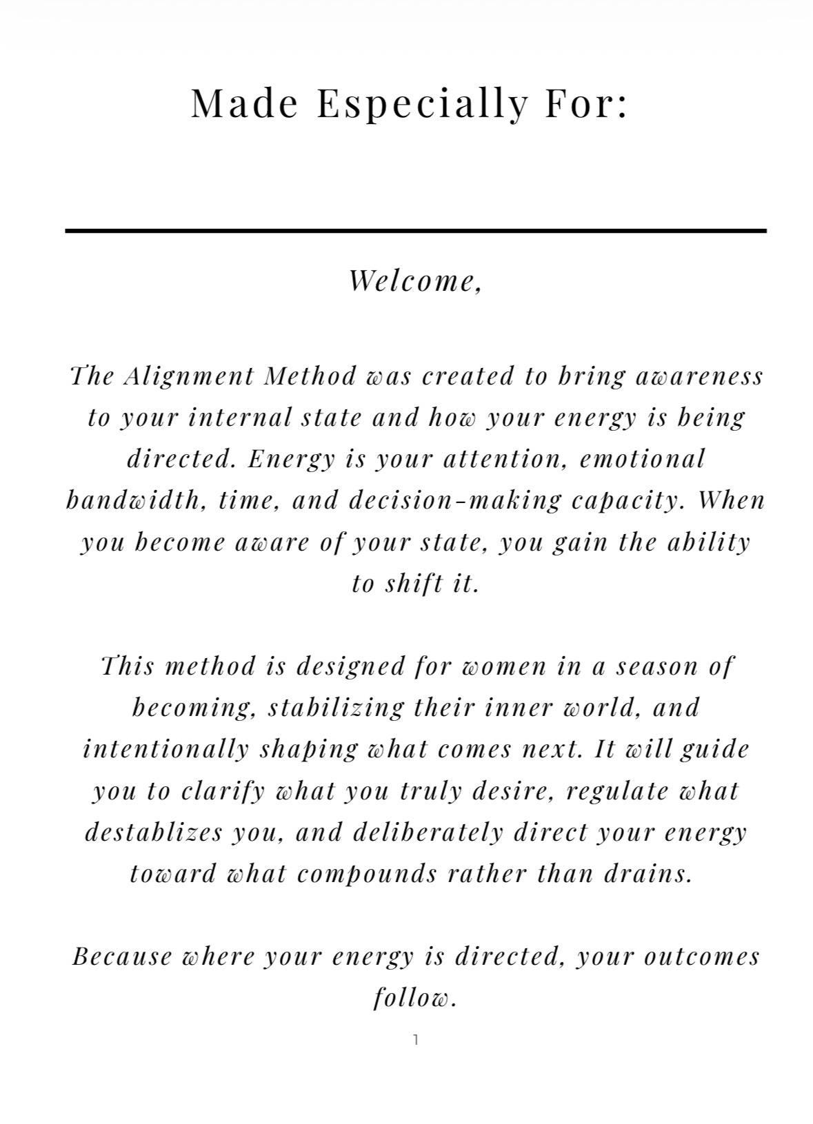 The Alignment Method was created to provide awareness of your internal state and how energy is being directed. This method is designed for women in a season of becoming, stabilizing their inner world, and intentionally shaping what comes next. Instead of reacting to circumstances or moving from emotion, this guides you to move with clarity and control.